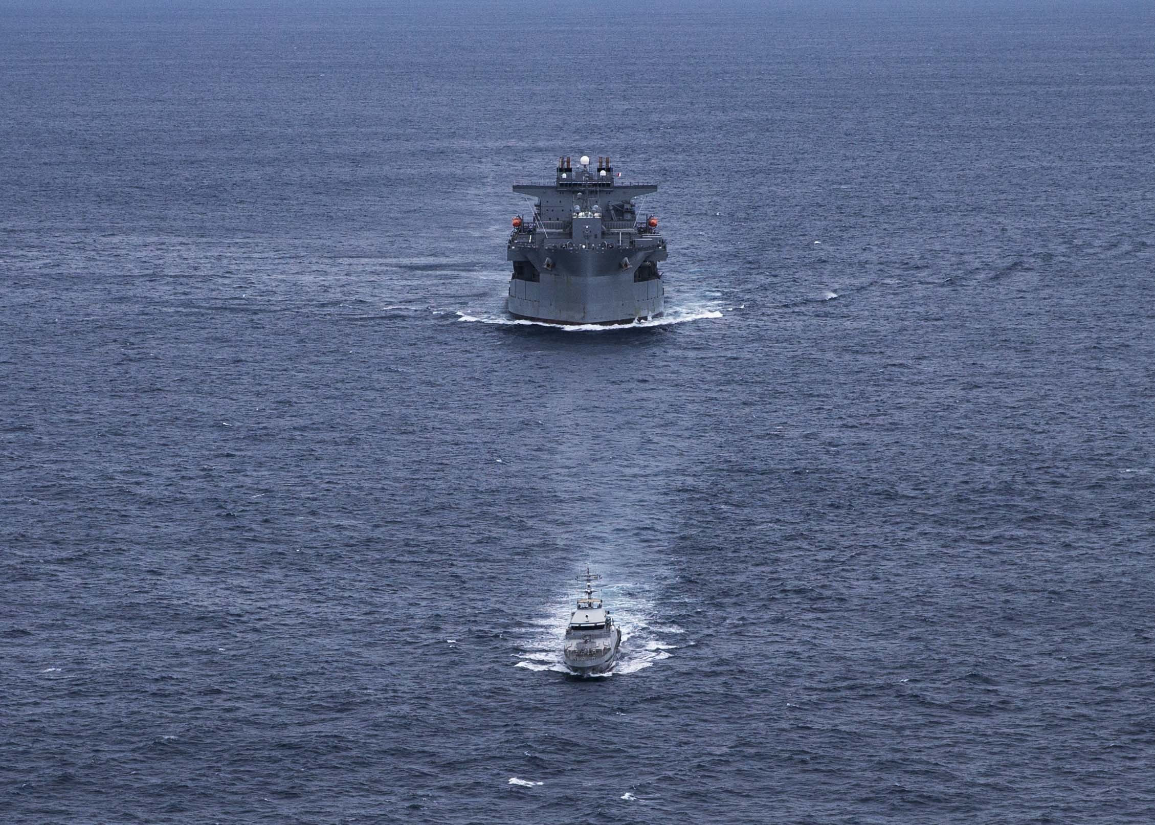 A U.S. Air Force B-52H Stratofortress, assigned to the 5th Bomb Wing at Minot Air Force Base, N.D., flies below a KC-135 Stratotanker assigned to the 100th Air Refueling Wing, Royal Air Force Mildenhall, United Kingdom, after receiving fuel above the Mediterranean Sea in support of a Bomber Task Force Europe mission, Sept. 16, 2020. The Stratotankers are deployed to RAF Fairford, U.K., in support of joint and combined training with U.S allies and partners. (U.S. Air Force photo by Senior Airman Jennifer Zima)