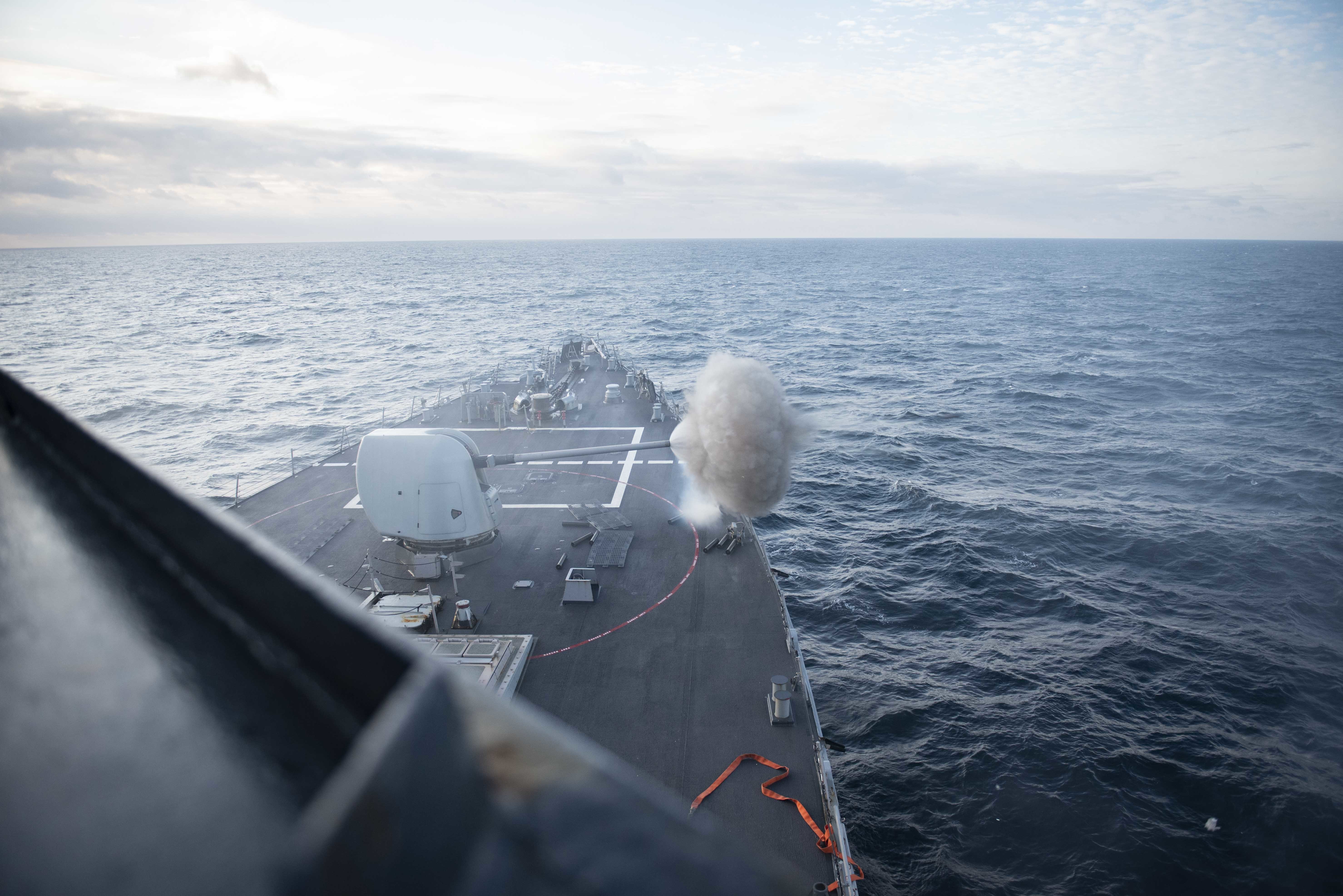ATLANTIC OCEAN (Jan. 23, 2021) Boatswain’s Mate 2nd Class Petty Officer Vernon Brown, assigned to the Ticonderoga-class guided-missile cruiser USS Vella Gulf (CG 72), gives take off signals to an MH-60S Sea Hawk, attached to the “Dusty Dogs” of Helicopter Sea Combat Squadron 7 Jan. 23, 2021. Vella Gulf is underway in the Atlantic Ocean conducting operations as part of the Dwight D. Eisenhower Carrier Strike Group. (U.S. Navy photo by Mass Communication Specialist 2nd Class Dean M. Cates)