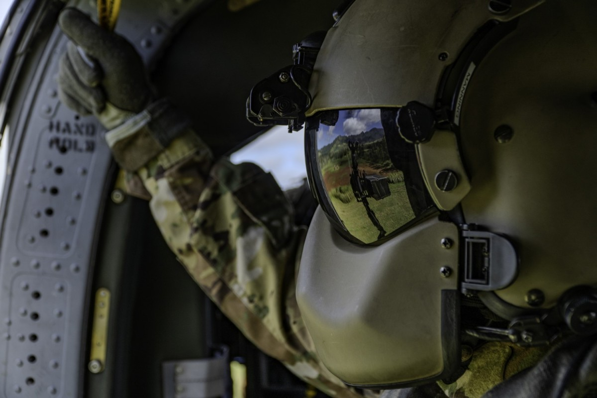 A U.S. Army Soldier with 3rd Battalion, 25th Aviation Regiment, 25th Combat Aviation Brigade, 25th Infantry Division, scans the horizon with an M240 Bravo machine gun reflected in his visor as he flies in a UH-60 Blackhawk during a live fire training exercise on Schofield Barracks on Oahu, Hawaii, Nov. 25, 2024. 3-25 AVN Soldiers provided cover fire and transport for 2nd Battalion, 27th Infantry Regiment, 3rd Infantry Brigade Combat Team, 25th ID Soldiers during a live fire training exercise. (U.S. Army photo by Spc. Charles Clark)