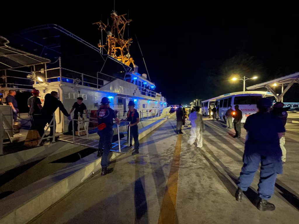 The crew of the Coast Guard Cutter Margaret Norvell transferring interdicted aliens to Bahamian authorities, Feb. 14, 2025. A total of 31 aliens were repatriated in Nassau. (U.S. Coast Guard photo)