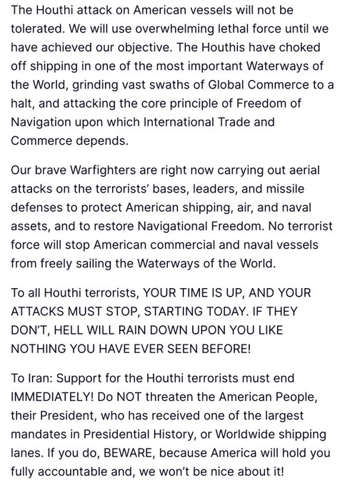 To Iran: Support for the Houthi terrorists must end IMMEDIATELY! Do NOT threaten the American People, their President, who has received one of the largest mandates in Presidential History, or Worldwide shipping lanes. If you do, BEWARE, because America will hold you fully accountable and, we won’t be nice about it!
