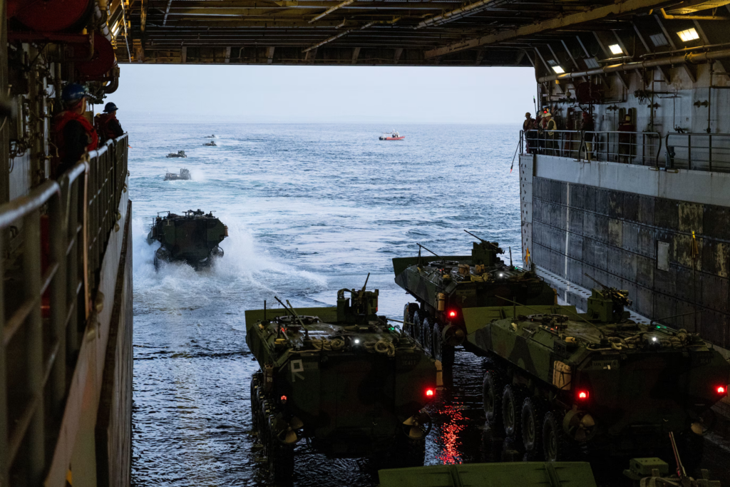 Featured Image: A High Mobility Multi-Purpose Wheeled Vehicle with 3rd Marine Logistics Group departs an Improved Navy Lighterage System during a 3rd MLG instream offload operation as part of Freedom Banner 25 at Republic of Korea Marine Corps Base Pohang, South Korea, Feb. 28, 2025. The instream offload, a training evolution alongside Beachmaster Unit 1, Naval Beach Group 1, and the ROKMC Marine Logistics Group, refines and validates 3rd MLG’s ability to transport, offload and distribute vehicles and equipment from ship to shore without the use of a pier. This type of sealift capability allows the unit to maneuver equipment in austere environments without using established infrastructure, such as in locations following a natural disaster. Freedom Banner 25 is a Maritime Prepositioning Force exercise where 3rd MLG offloads equipment and provides support to III Marine Expeditionary Force units training throughout South Korea, testing and validating 3rd MLG’s ability to conduct integrated logistics operations in complex environments. (U.S. Marine Corps photo by Gunnery Sgt. Jonathan G. Wright)