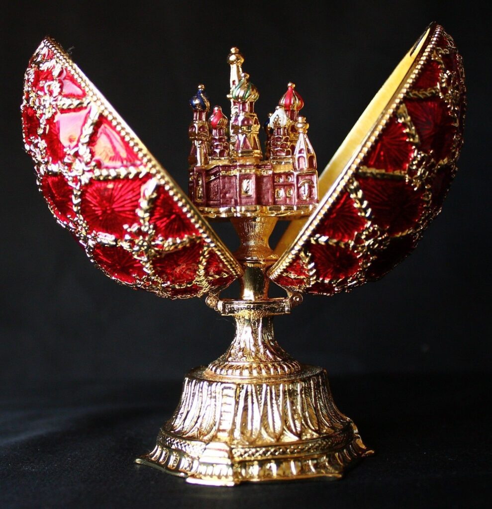 Again, I was able to find a definition of today’s Faberge egg. It is St Petersburg Russian Faberge Egg: Romanov Egg with St Basil’s cathedral.