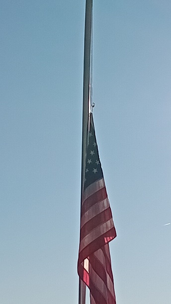 Raised full staff, then lowered to half-staff till noon, to Honor those who died in battle, then full-staff for the remaining of the day to honor our living Brothers & Sisters.