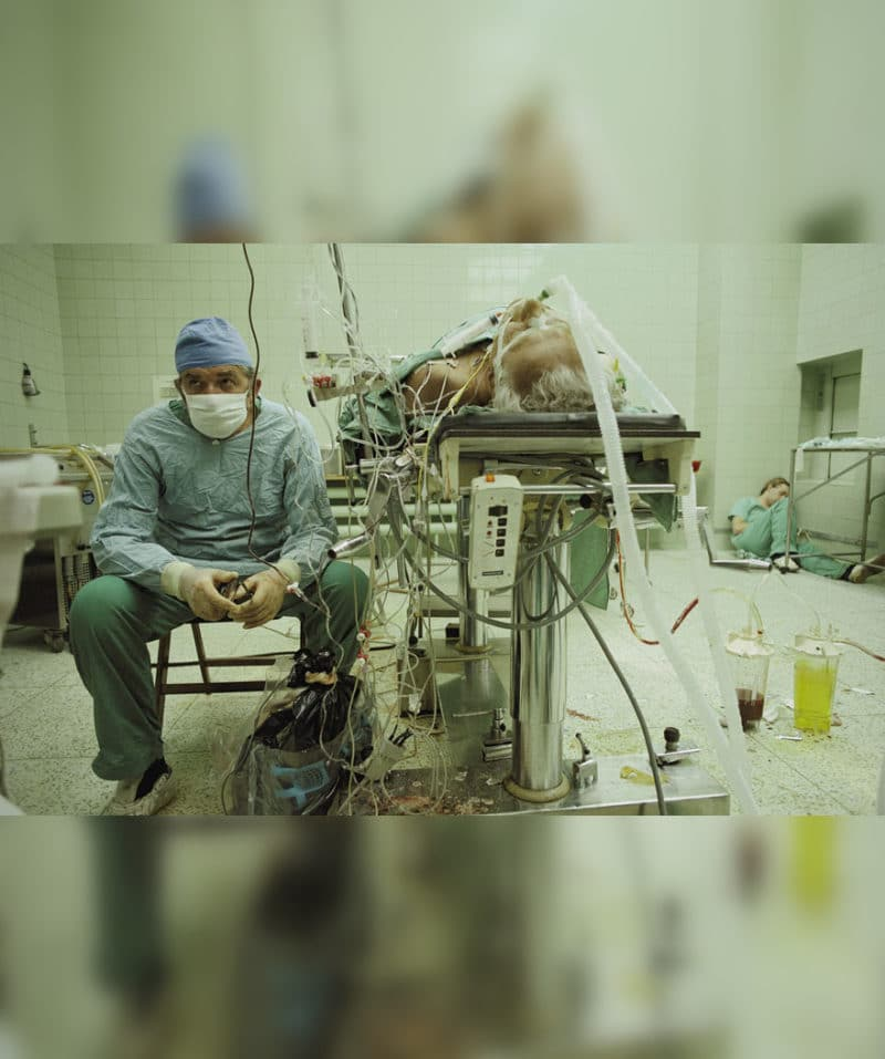 This is a photo of a surgeon resting after a successful 23-hour heart transplant operation. If you look carefully, you can see his assistant sleeping in the corner. Looks like he used ever tool in his toolbox to save a life,