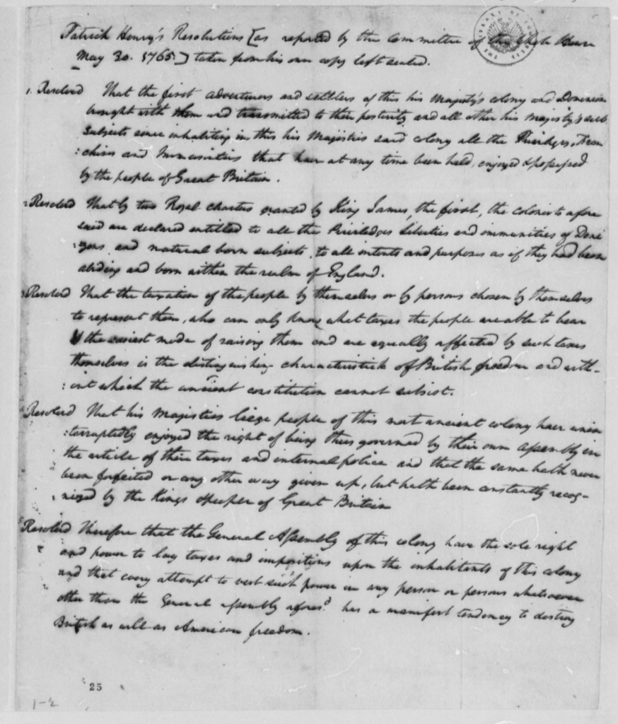 As a result of the Virginia Resolves, he firmly established the refrain, “No Taxation without representation”!! He would continue to be a voice for Colonial America. On March 23, 1775, some ten years after his introduction of the Virginia Resolves, he made his famous declaration: