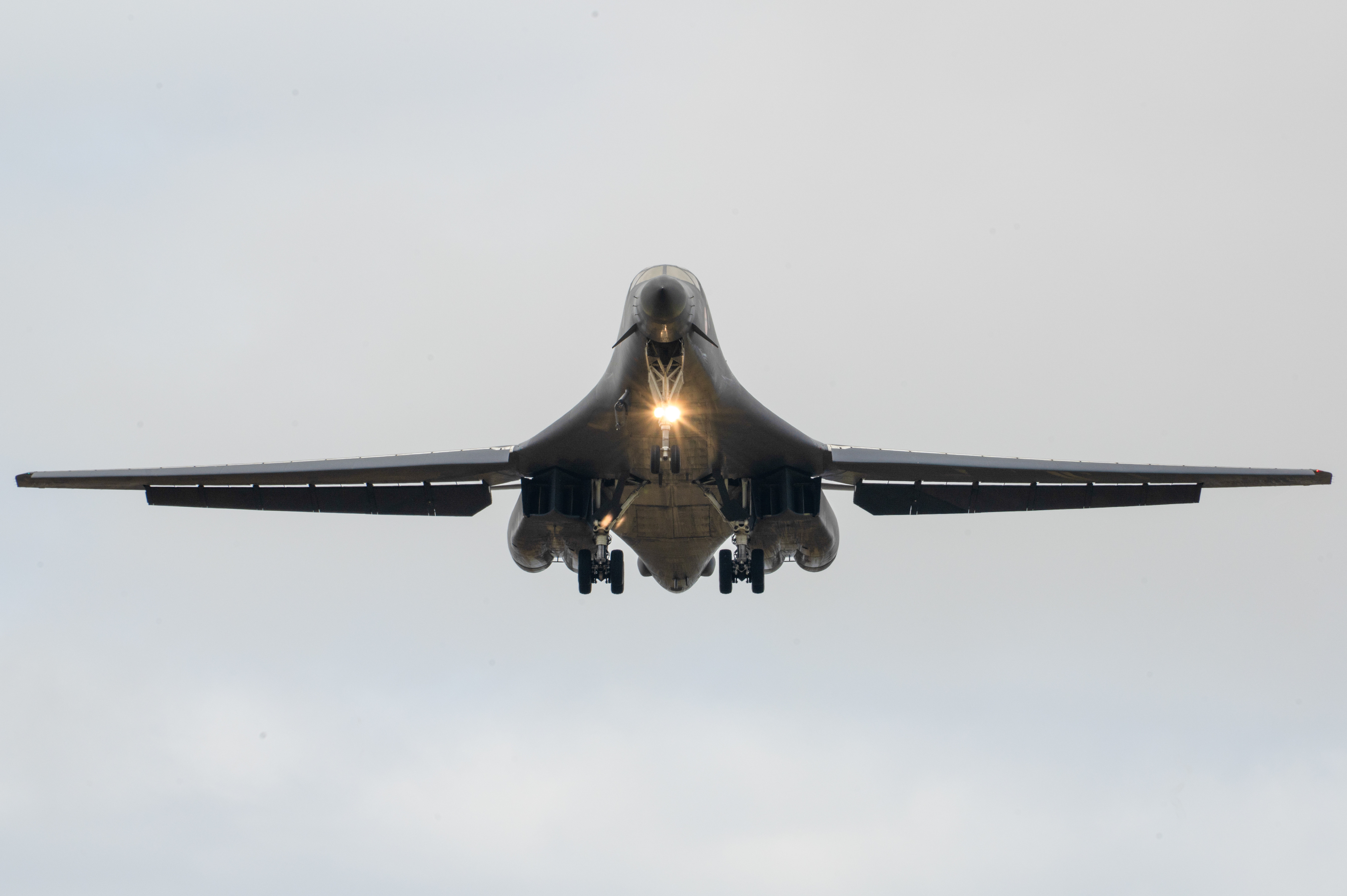 A U.S. Air Force B-1B Lancer assigned to the 345th Expeditionary Bomb Squadron, descends for…