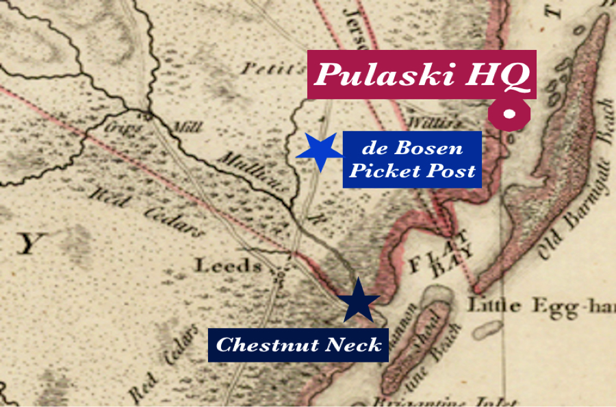 “The Battle of Chestnut Neck”, October 6, 1778 was an effort by the British to quell the privateers who used Little Egg Harbor as a base of operations. The supplies that were meant for the British often ended up with General Washington and his troops at Valley Forge. The fight against the American patriots was cut short when the British realized that Count Casimir Pulaski and his cavalry were on their way; the British made a hasty retreat up river to avoid Pulaski and his troopers.