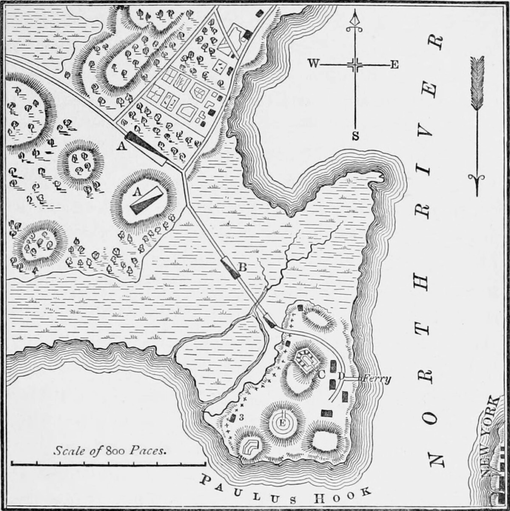 03:30, August 19. 1779; Major Henry “Light Horse Harry” Lee reached the outer defenses of the British outpost on Paulus Hook. The outpost guarded the entry into New York Harbor; Lee’s troopers forced entry into the outpost and “The Battle of Paulus Hook” was underway. Major William Sutherland, the post commander, retired to a small redoubt with a few of his officers and some 40 Hessian troopers. As daylight was about to break, Lee had the cannon spiked and decided to leave the area but had decided to burn the post’s barracks before leaving. On learning that the barracks held some wounded men and a number of women and children, he decided against burning the barracks and vacated the post. Lee’s casualties numbered 2 killed, 3 wounded and 7 captured, while British losses numbered 50 killed and wounded and 158 captured. Lee was forced to return by an alternate route to his base but was successful in doing so with so few men and so large a contingent of captured soldiers.