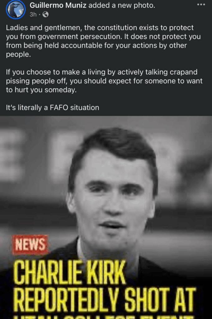 On the Mil side, heads keep rolling. Today I bring you news of a relief, not just a suspension. Major Guillermo Muniz, commander of the 22nd mobile public affairs detachment at Ft Bragg has been relieved of command. Muniz posted that the Kirk assassination was “literally a FAFO situation.”