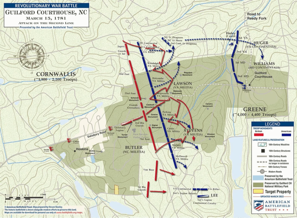 In what has been called the biggest, most consequential and hotly contested Revolutionary War battle in the southern colonies, Lieutenant General Charles Cornwallis defeated Major General Nathaniel Greene’s army at “The Battle of Guilford Courthouse”, March 15, 1781. Greene’s losses were 79 killed and 185 wounded with a large number of the militia returning home after the battle. Cornwallis lost about 27% of his fighting force with 93 killed, 413 wounded and 26 missing. Cornwallis in his haste to confront Greene’s army had pushed his troopers to the point of exhaustion in an effort to force a battle with Greene’s men. As Greene turned his army back into South Carolina, Cornwallis was forced to plunder the residents of the area to feed and supply his weary troops. He then marched to Wilmington, North Carolina to rest and resupply his troops.