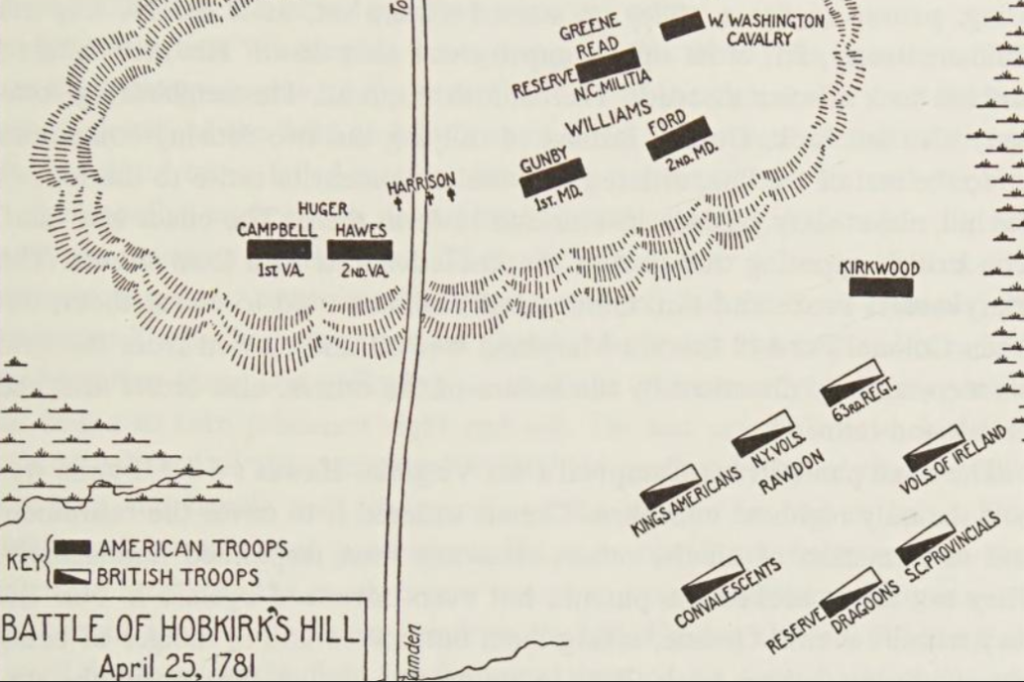 The second battle on April 25, 1781 occurred near Camden, South Carolina where General Nathaniel Greene with a force of about 1,550 confronted the much smaller force commanded by General Francis Rawdon. Rawdon’s force of 900 forced a retreat by Greene’s militia. This engagement would be called “The Battle of Hobkirk’s Hill”. Despite Rawdon’s victory, he retreated to Camden, only to eventually retreat towards Charleston, South Carolina.
