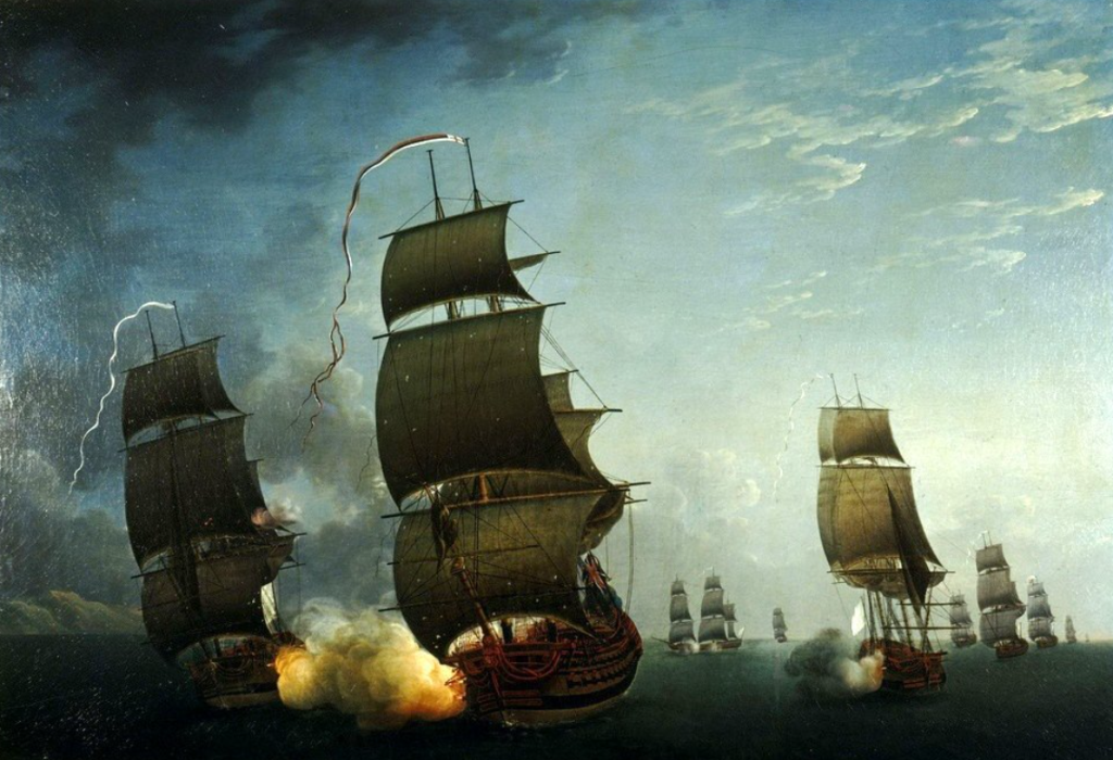An inconclusive naval battle occurred on the same day as the Battle of Guilford Courthouse between British ships of the line and French vessels at “the Battle of Cape Henry”. Both contestants suffered casualties with the British sustaining 30 killed and 73 wounded while French casualties numbered 72 killed and 112 wounded. As neither side could claim a victory, the French returned to Rhode Island while the British took up station off the coast of Chesapeake Bay.
