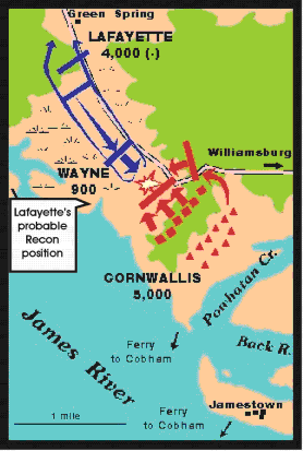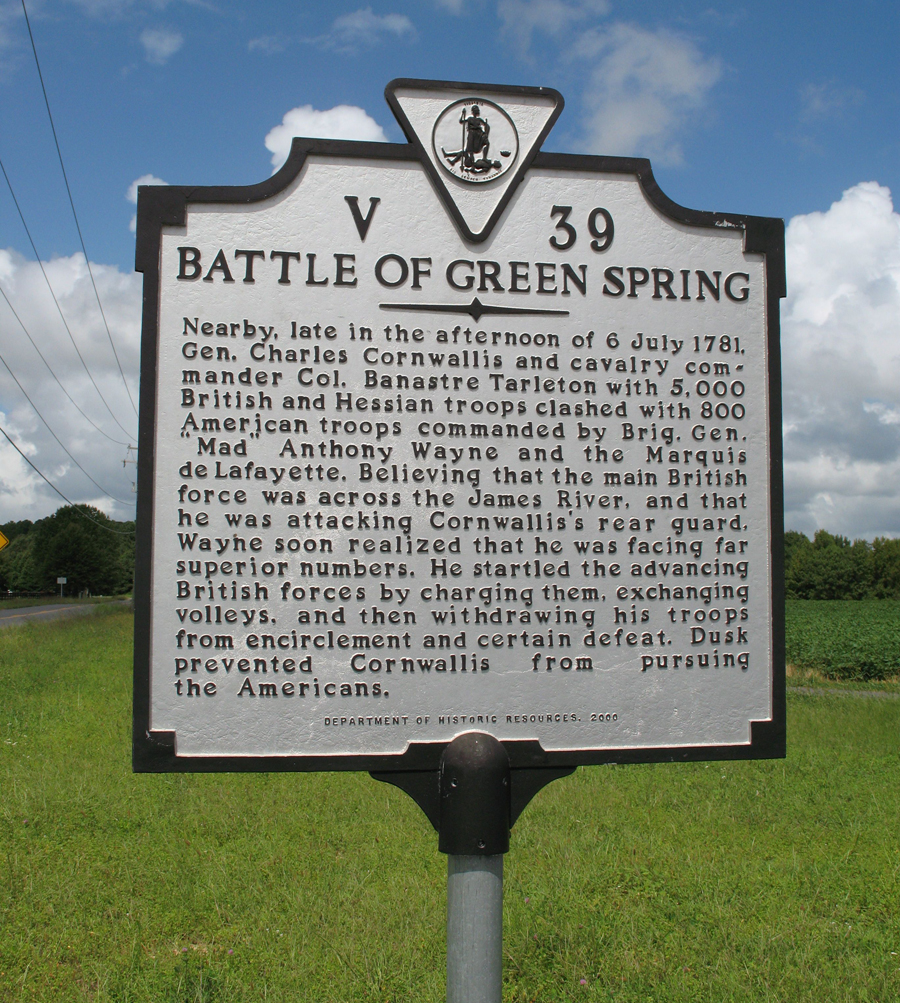 “The Battle of Green Spring”, July 6, 1781 was the last large engagement between Cornwallis and Lafayette before the siege of Yorktown. As Cornwallis maneuvered to cross the James River in Virginia, Lafayette sent Brigadier General Anthony Wayne to contest the crossing. Cornwallis had set a trap but in a bold move, general Wayne ordered a bayonet charge against the numerically superior British force, but the ferocity of Wayne’s attack forced the British to back away. The overall battle was a British victory but the British suffered 75 killed and wounded while the Americans suffered 28 killed. The British would be harassed continually by the Americans, keeping their foraging troops in a continual state of confusion while denying them the forage they needed for their troops and horses.