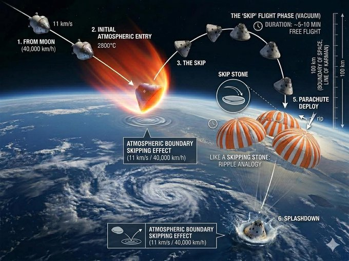 Orion is flying at 40,000 km/h. At that speed, the atmosphere isn’t air, it’s a wall. You can’t just dive down—the crew would be crushed by the G-forces, and the ship would burn up. So they came up with this idea. Orion will enter the atmosphere, heat up to 2800 degrees, and bounce back into space. Like a pebble bounces off water. Remember throwing flat stones down a river as a kid? Up there, it has a couple of minutes to cool down. Then it reenters and lands.