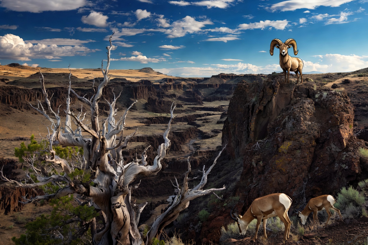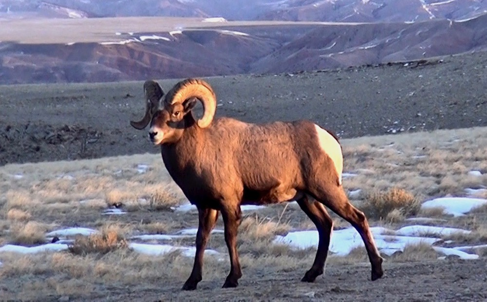 The Bighorn is a species of native North American sheep named for its large horns. They originally migrated to North America from Siberia by way of the Bering Land Bridge during the Pleistocene Era approximately 750,000 years ago. They diverged from the Siberian sheep some 600,000 years ago as they spread through the western US to northern Mexico. The main differences today are the larger mountain bighorn and the smaller desert bighorn; the two subspecies came into being during the Illinoian glaciation (300,000 to 90,000 years ago).