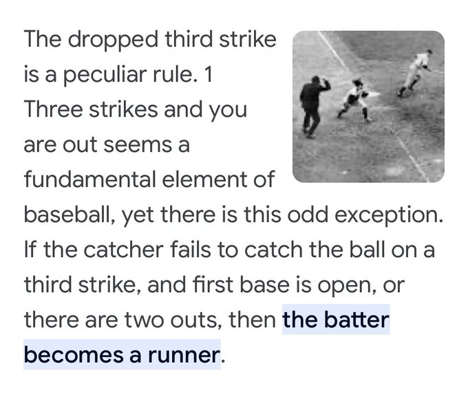 Unfortunately for Hornell, the third strike didn’t mean an out because the catcher dropped the ball. The rules state that a dropped third strike means the batter is safe and is now a runner.