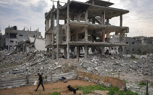 A Palestinian walks past destroyed residential buildings damaged by the Israeli air and ground offensive…